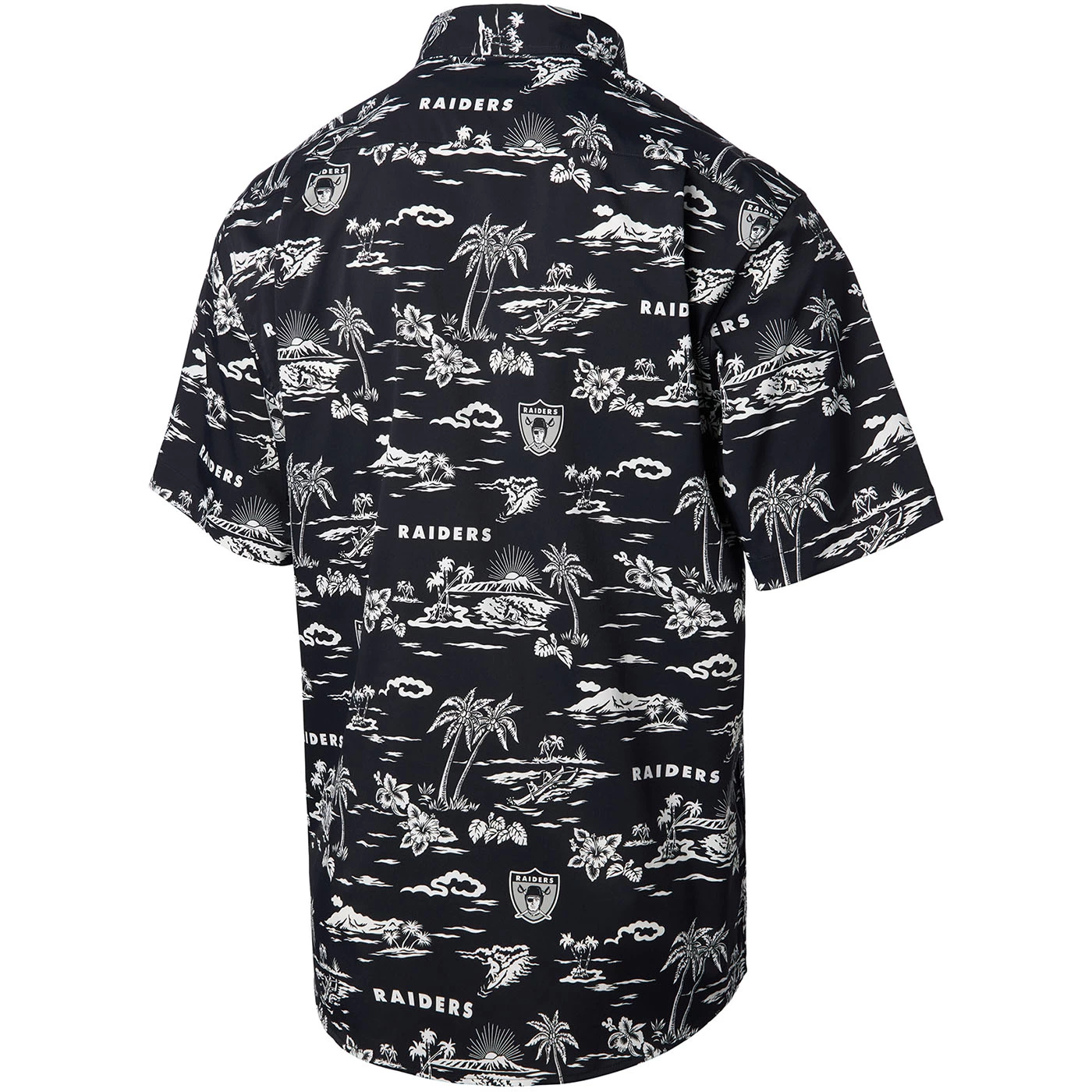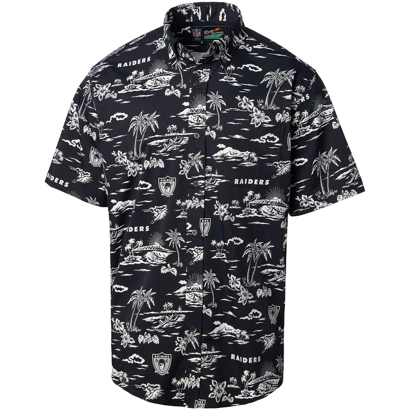 The Raiders Throwback Kekai Performance Button Front Top by Reyn Spooner is designed with ultra-soft UPF 50+ fabrication to protect you against the sun year round. This Hawaiian shirt has a relaxed fit with four-way stretch quick-dry technology and a side vent. Features an all-over tropical print plus repeat team wordmark and 1963 logos. 92% nylon 8% spandex.