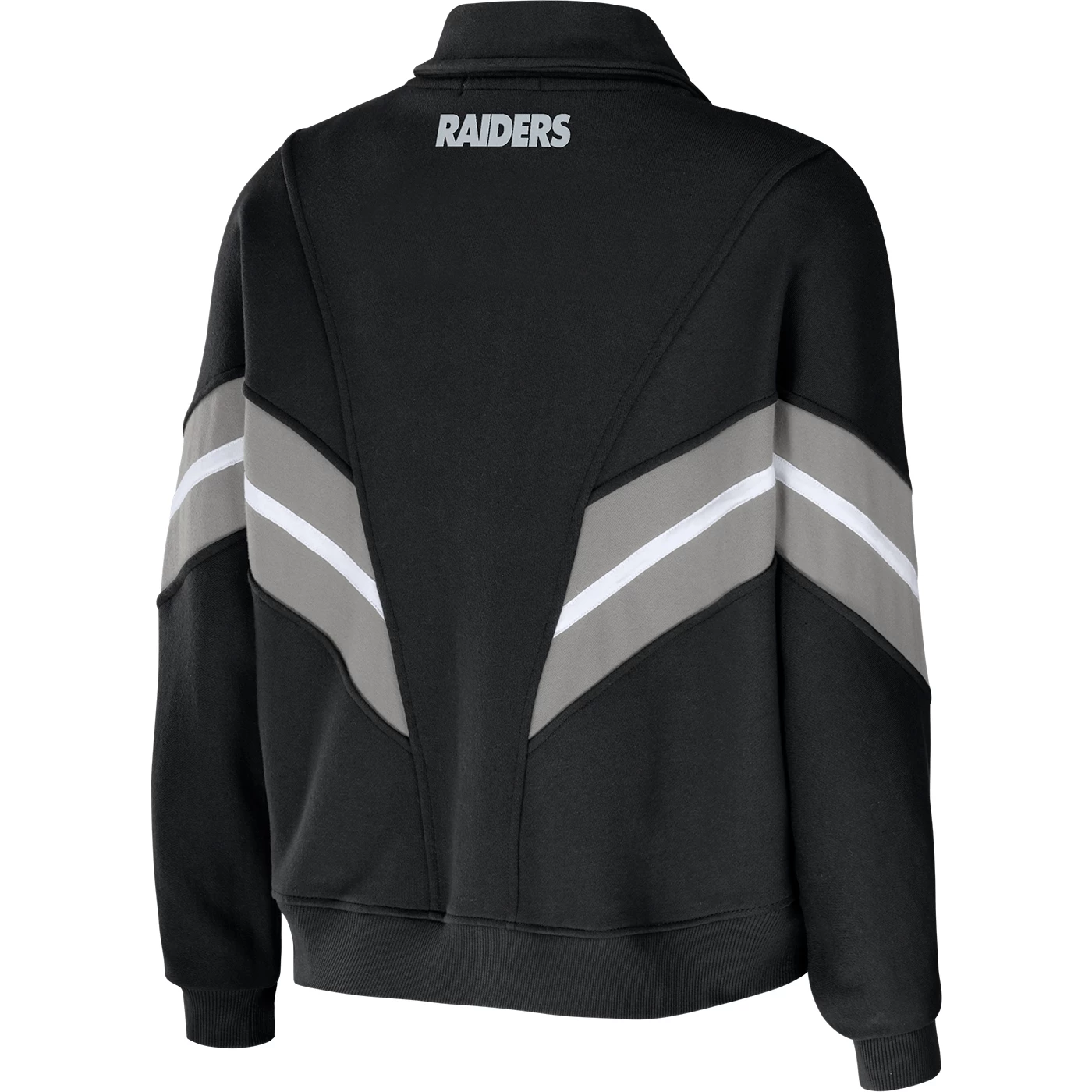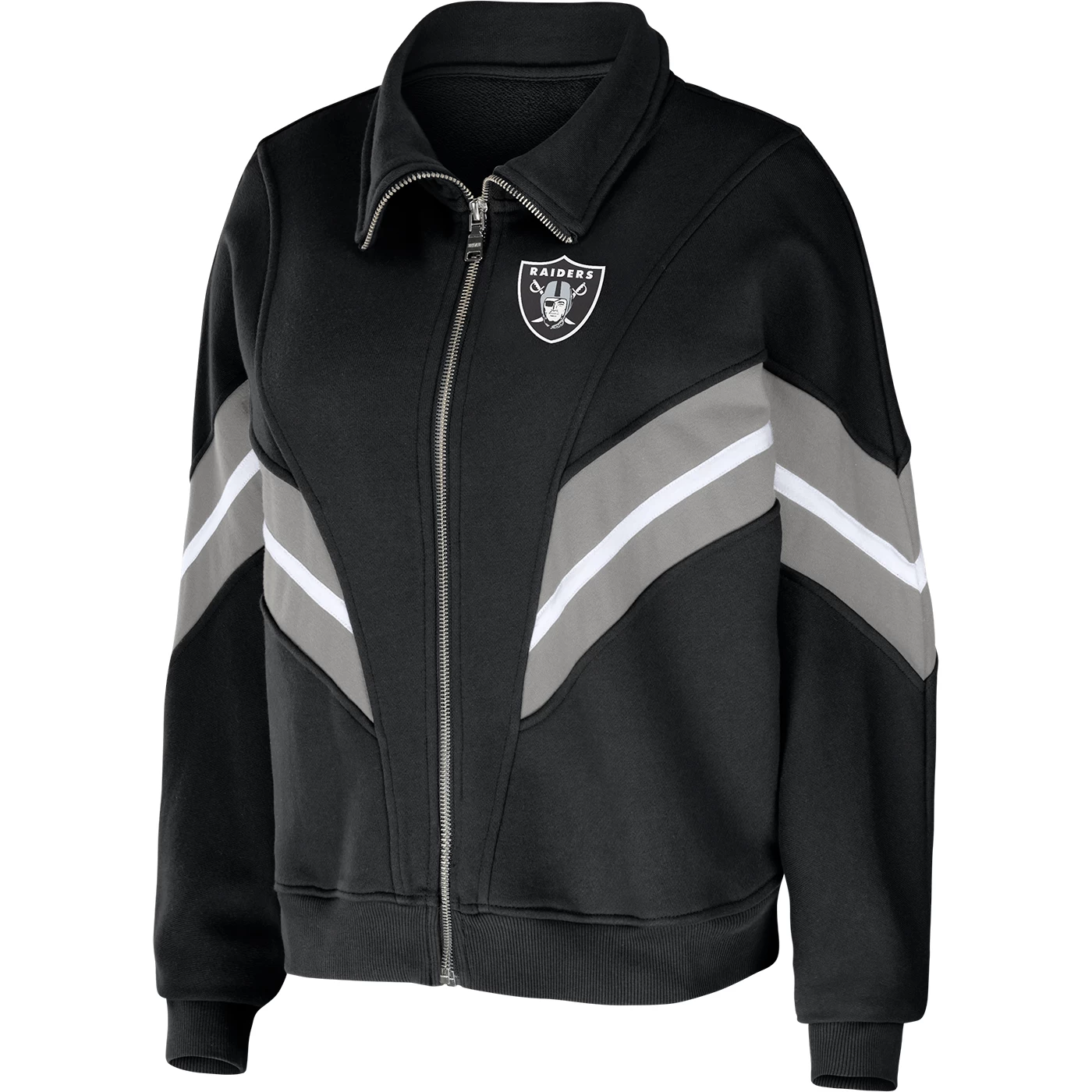Cozy up for game day! The Raiders WEAR by Erin Andrews Full-Zip Sweatshirt is designed with soft rib knit fabrication and a rolled collar. This jacket has an alternate team-colored chevron design across the body and sleeves and features team logos printed at upper chest and back.