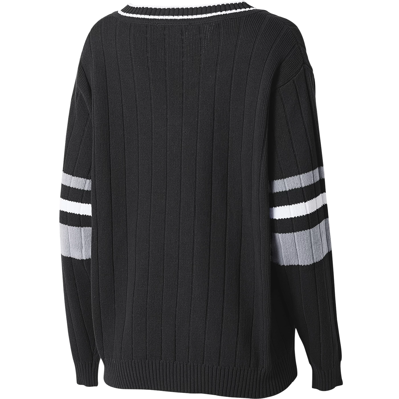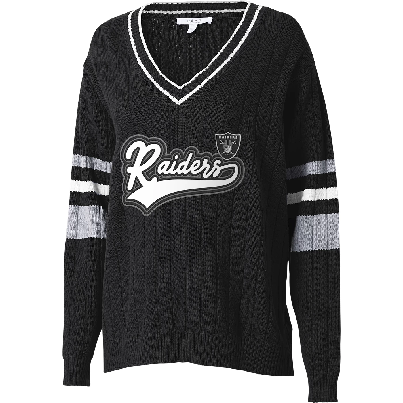 The Raiders WEAR by Erin Andrews V-Neck Sweater is inspired by a classic varsity knit cardigan silhouette and has alternate team-colored stripes at the collar and sleeves. Features vintage-inspired “Raiders” script and team shield logo applique across the chest. Made from cotton acrylic rib sweater knit fabrication.