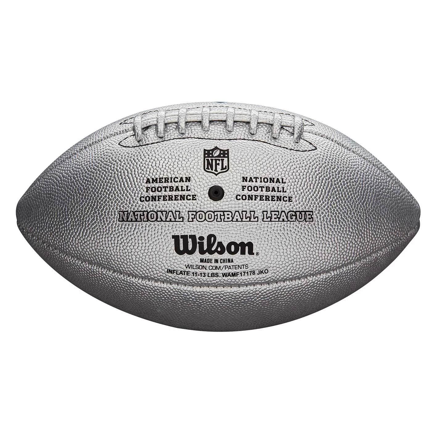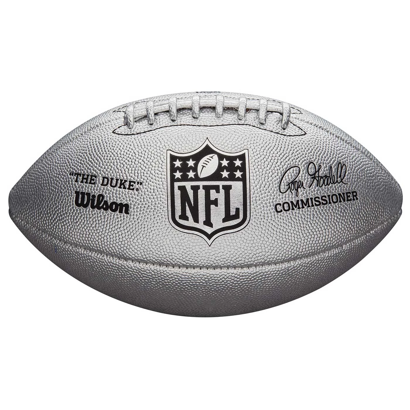 Inspired by the official on-field football of the NFL the Duke Replica Football Silver by Wilson features a metallic high-performance leather composite cover to provide a premium tacky feel. Official regulation size for High School and College Football ideal for ages 14 and up.