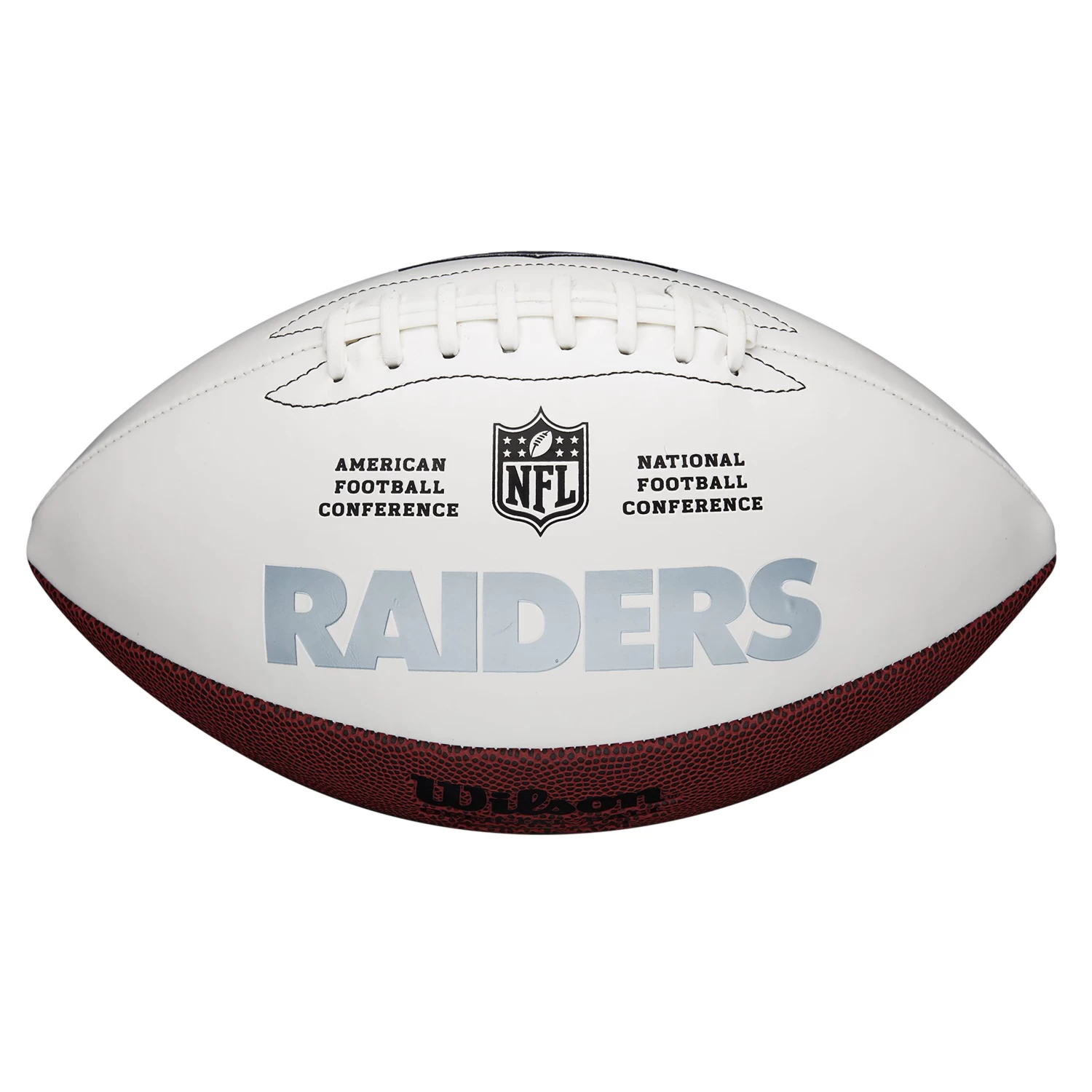 Add to your collection with the Las Vegas Raiders Official Autograph Football by Wilson. This multi panel football is perfect for signatures and features the team shield and wordmark logos. 100% leather.